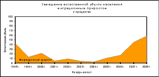 Сокращение численности населения происходило из-за естественной убыли населения, которая в январе-августе 2008г. уменьшилась по сравнению с соответствующим периодом 2007г. на 76,2 тыс.человек. Увеличившийся миграционный прирост на 58,4% компенсировал численные потери населения.