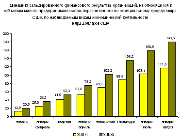 О финансовых результатах деятельности организаций В январе-августе 2008г., по оперативным данным, сальдированный финансовый результат (прибыль минус убыток) организаций (без организаций, осуществляющих деятельность в растениеводстве, животноводстве, растениеводстве в сочетании с животноводством (смешанное сельское хозяйство), без субъектов малого предпринимательства, банков, страховых и бюджетных организаций) в действующих ценах составил +4302,4 млрд.рублей, или +180,5 млрд.долларов США (40,4 тыс. организаций получили прибыль в размере 4883,1 млрд.рублей, 16,0 тыс. организаций имели убыток на сумму 580,7 млрд.рублей). В январе-августе 2007г. сальдированный финансовый результат составил (по сопоставимому кругу организаций) +3038,5 млрд.рублей, или +117,3 млрд.долларов США. Сальдированный финансовый результат (прибыль минус убыток)