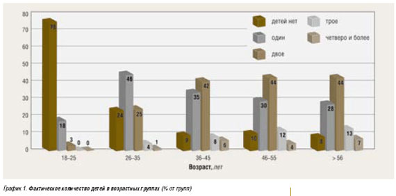 Реальное количество детей в российских семьях заметно отличается от желаемого. Четверть опрошенных (25%) сообщили, что детей у них нет. Естественно, эта группа формируется в основном за счет респондентов молодого возраста, еще не успевших обзавестись чадами. Так, в возрастной группе 18-25 лет доля не имеющих детей составляет, согласно опросу, 78%; в возрастной группе 26-35 лет - уже только 24%; в возрастных группах старше 36 лет - 8-10%. Далее, треть опрошенных сообщили об одном ребенке (31%), треть - о двоих (33%), 8% - о троих, у 4% - четверо детей и более. Распределение количества детей у респондентов по возрастным группам представлено на графике 1. Как и следовало ожидать, картины в трех возрастных группах старше 36 лет схожи. И, как видим, большинство респондентов останавливаются на одном-двух отпрысках.