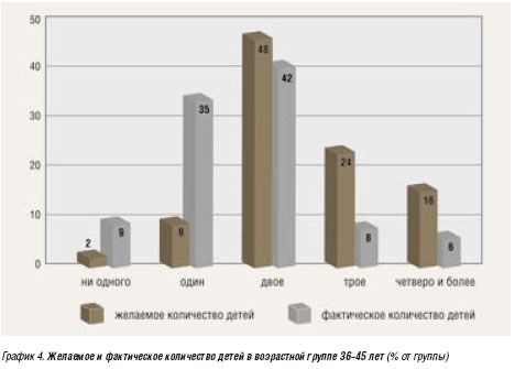 Всего, согласно полученным данным, 57% опрошенных в возрасте 36-45 лет заявляют, что хотели бы иметь больше детей, чем у них есть; в группе 46-54-летних эта доля составляет 43% (в более молодых группах она, естественно, существенно выше - но эти респонденты, скорее всего, еще и не закончили свою репродуктивную деятельность).