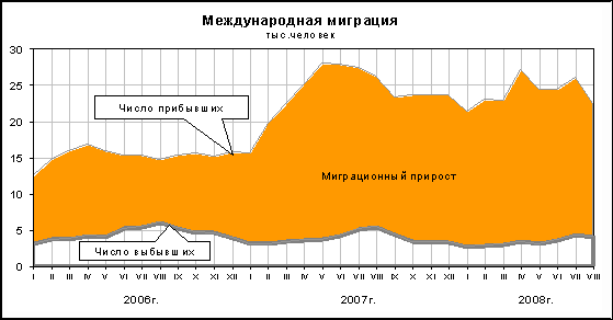 Сокращение численности населения происходило из-за естественной убыли населения, которая в январе-августе 2008г. уменьшилась по сравнению с соответствующим периодом 2007г. на 76,2 тыс.человек. Увеличившийся миграционный прирост на 58,4% компенсировал численные потери населения.