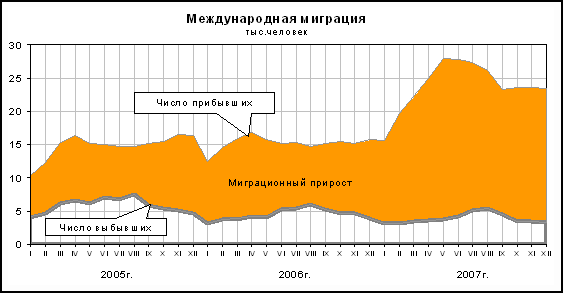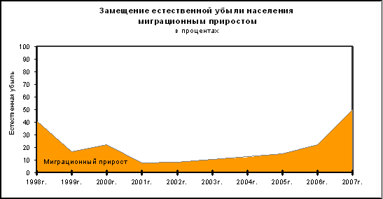 Сокращение численности населения происходило из-за естественной убыли населения, которая в 2007г. уменьшилась по сравнению с 2006г. на 209,4 тыс.человек. Увеличившийся миграционный прирост на 50,2% компенсировал численные потери населения.