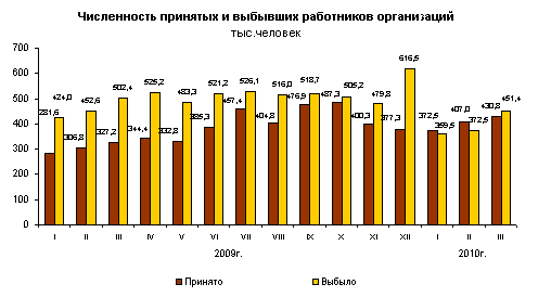 Прием и увольнение работников. В отличие от января и февраля 2010г., в марте численность выбывших работников организаций превысила численность принятых работников на 20,6 тыс.человек.