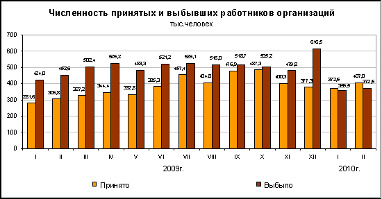 Прием и увольнение работников. В феврале 2010г. численность принятых работников организаций превысила численность выбывших работников на 34,5 тыс.человек.