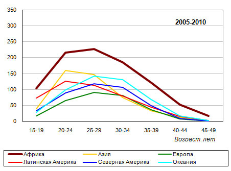 Как правило, рождаемость снижается тогда, когда женщины начинают ограничивают размер собственной семьи, заканчивая период деторождения раньше, чем их матери. Соответственно, снижается рождаемость в старших возрастах и средний возраст матери при рождении ребенка. Когда рождаемость населения уже относительно низка, наблюдается другой процесс: женщины откладывают рождение ребенка, что сокращает рождаемость в младших возрастах и увеличивает средний возраст матери при рождении ребенка. Эти процессы наглядно прослеживаются по изменению возрастных коэффициентов рождаемости в регионах мира (рис. 6).